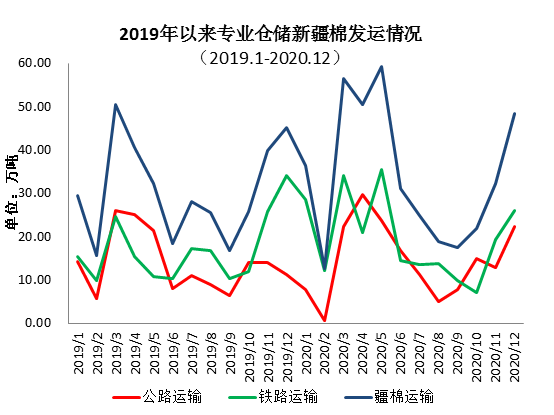 12月,新疆棉花專業(yè)倉儲庫出疆發(fā)運量為48.31萬噸,環(huán)比增加16.15萬噸,高于去年同期3.08萬噸。